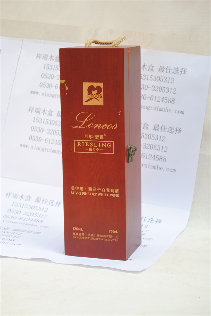 單只裝油漆紅酒禮品包裝木盒:原料多為實木,高拋光后,先做一遍底漆,再做有色面漆,LOGO圖案等多是激光鐳射的工藝,木盒里面可以用木卡貨是內(nèi)襯固定酒瓶。